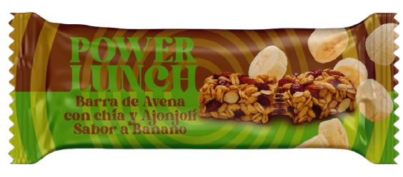 Barra de cereal con avena, chía y ajonjolí y sabor a banana.