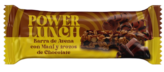 Barra de cereal con avena, maní y trozos de chocolate.